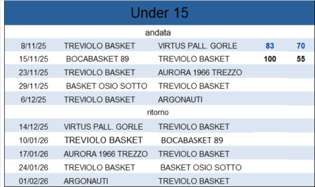 Seconda sconfitta consecutiva per i ragazzi U15 con di nuovo un punteggio abbastanza pesante. Solita partenza abbastanza equilibrata poi nel secondo quarto black out per i nostri ragazzi che ha permesso agli avversari di allungare in maniera decisiva già prima dell'intervallo. La ripresa nel terzo quarto non porta novità, anzi allunga ulteriormente la distanza e gli sforzi dell'ultimo quarto sono vani.