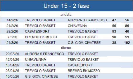 Seconda sconfitta consecutiva per i ragazzi U15 con di nuovo un punteggio abbastanza pesante. Solita partenza abbastanza equilibrata poi nel secondo quarto black out per i nostri ragazzi che ha permesso agli avversari di allungare in maniera decisiva già prima dell'intervallo. La ripresa nel terzo quarto non porta novità, anzi allunga ulteriormente la distanza e gli sforzi dell'ultimo quarto sono vani.